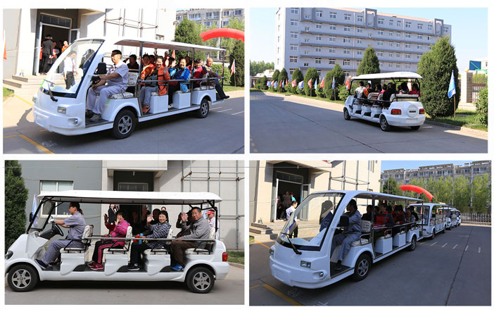 健身愛(ài)好者們乘觀光車參觀康姿百德第一科技園