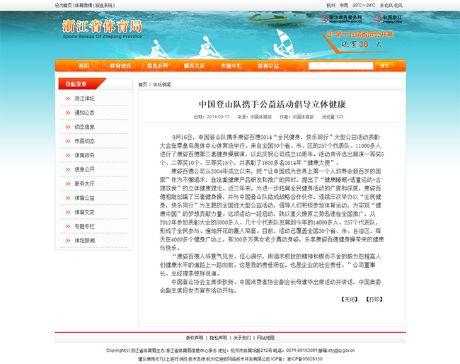浙江體育局官網(wǎng)以《中國登山隊攜手公益活動倡導(dǎo)立體健康》為題,對2014“全民健身 快樂同行”大型公益活動表彰大會進行報道。