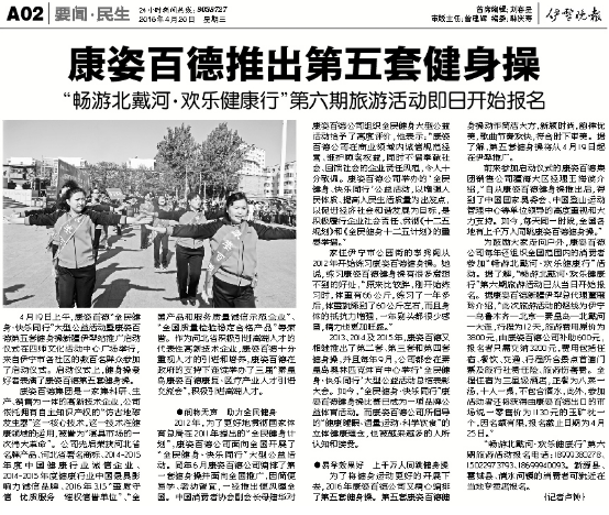 2016年4月初,康姿百德“全民健身·快樂同行”大型公益活動暨康姿百德第五套健身操啟動儀式相繼在北戴河、南昌舉行,此次新疆站是健身操啟動儀式的第三站。《伊犁日報》、《伊犁晚報》等媒體對此次活動進行了報道。
