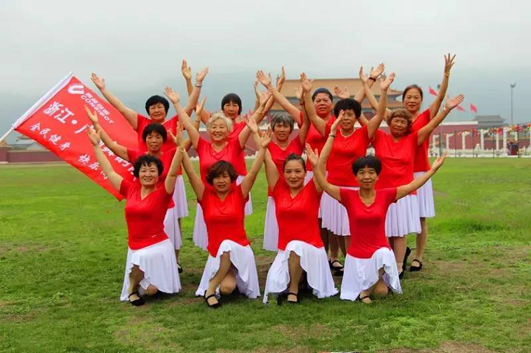 在古建筑恢宏氣勢的映襯下,大家踏著歡快的節(jié)拍,律動優(yōu)美的體姿,用跳健身操的方式表達(dá)著對美好生活的向往。
