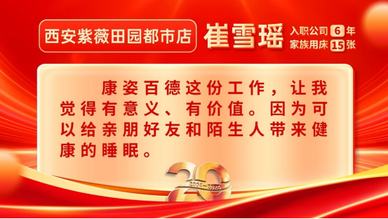在加入康姿百德之前,崔雪瑤就了解過康姿百德產(chǎn)品,軟硬適中,不易變形,品質(zhì)有保障。于是在入職第一個(gè)月就買了第1張床墊。隨著來公司的時(shí)間越來越久,崔雪瑤覺得產(chǎn)品質(zhì)量是真的好,并將產(chǎn)品推薦給親朋好友。如今,這些親朋好友已累計(jì)使用15張康姿百德床墊。在康姿百德工作這幾年,崔雪瑤也覺得這份工作有意義、有價(jià)值,因?yàn)檫@份工作可以給親朋好友和陌生人帶來健康的睡眠。尤其是聽著顧客向她講述康姿百德床墊睡著非常舒服,并且把這么好的產(chǎn)品不斷推薦給身邊人,如今身邊使用康姿百德床墊的人越來越多。崔雪瑤聽后內(nèi)心更是滿滿的自豪感!她表示,作為一名康姿百德人,真的非常地驕傲和幸福!