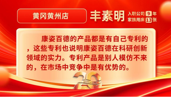豐素明自己比較認(rèn)可有科技含量的產(chǎn)品,所以入職第一年就買(mǎi)了1張康姿百德床墊。每當(dāng)有人因?yàn)椴涣私猱a(chǎn)品而持懷疑態(tài)度,豐素明總是自信的告訴客戶(hù)“我可以很負(fù)責(zé)的告訴大家,康姿百德產(chǎn)品都是有專(zhuān)利的,也是有質(zhì)量保障的”。很多客戶(hù)聽(tīng)說(shuō)康姿百德床墊有多項(xiàng)專(zhuān)利技術(shù)加持,都是本著試試的心態(tài),最后都成了忠實(shí)客戶(hù)。每當(dāng)客戶(hù)向豐素明說(shuō)康姿百德產(chǎn)品好,豐素明心里都是滿(mǎn)滿(mǎn)的自豪感!