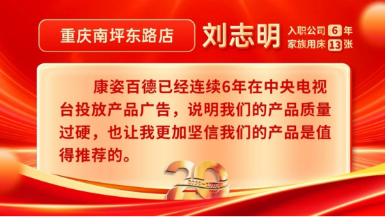 每當(dāng)劉志明給客戶(hù)介紹產(chǎn)品,提到我們是上過(guò)央視的品牌,都是滿(mǎn)滿(mǎn)的自豪感?!狈浅s幸成為康姿百德的一名員工,公司良好的品牌形象也給我?guī)?lái)了社會(huì)認(rèn)可度和尊重感,讓我結(jié)識(shí)了很多朋友,收獲了許多快樂(lè)和感動(dòng)。今后,我會(huì)把康姿百德作為自己的終身事業(yè),把好產(chǎn)品推薦給更多的人?!?/span>