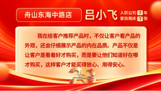 今年是康姿百德集團(tuán)成立20周年。在20年的發(fā)展歷程中,有這樣一群人,他們在市場經(jīng)營管理過程中,深刻貫徹以客戶為中心的理念,始終把優(yōu)質(zhì)的服務(wù)融于門店經(jīng)營的每個(gè)環(huán)節(jié),也因此得到了客戶的贊賞和認(rèn)可。他們就是康姿百德專賣店的員工。本期和您分享的是康姿百德浙江地區(qū)專賣店員工代表的故事。