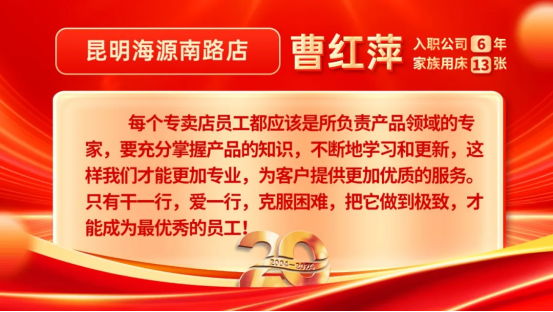 今年是康姿百德集團(tuán)成立20周年。在20年的發(fā)展歷程中,有這樣一群人,他們?cè)谑袌?chǎng)經(jīng)營(yíng)管理過(guò)程中,深刻貫徹以客戶為中心的理念,始終把優(yōu)質(zhì)的服務(wù)融于門(mén)店經(jīng)營(yíng)的每個(gè)環(huán)節(jié),也因此得到了客戶的贊賞和認(rèn)可。他們就是康姿百德專賣(mài)店的員工。本期和您分享的是康姿百德云南地區(qū)和廣東地區(qū)專賣(mài)店員工代表的故事。