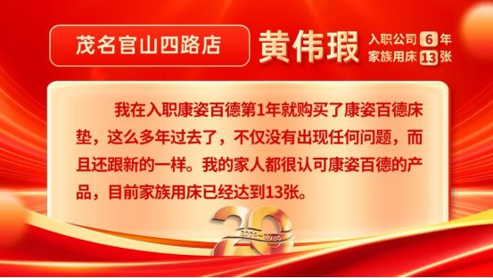黃偉瑕說(shuō)道:“我在入職康姿百德第1年就購(gòu)買(mǎi)了康姿百德床墊,這么多年過(guò)去了,不僅沒(méi)有出現(xiàn)任何問(wèn)題,而且還跟新的一樣。我的家人都很認(rèn)可康姿百德的產(chǎn)品,目前家族用床已經(jīng)達(dá)到13張。我目前最大的愿望就是要讓更多消費(fèi)者知道康姿百德這個(gè)品牌,認(rèn)可康姿百德,讓康姿百德成為廣東茂名地區(qū)有影響力的寢具品牌?!?/span>