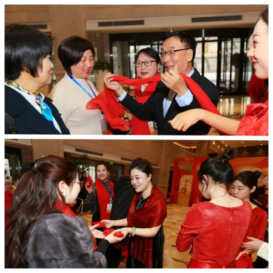 年會(huì)伊始,一條鮮紅的星光大道從會(huì)場(chǎng)入口延伸至主舞臺(tái)。全體參會(huì)家人身著正裝,神采奕奕踏上紅毯,在攝影鏡頭的聚焦下展現(xiàn)自信風(fēng)采。董事長李銀祥攜管理層團(tuán)隊(duì)親自迎接,為每一位家人佩戴象征“鴻運(yùn)當(dāng)頭”的定制紅絲巾。簽名墻上,密密麻麻的名字不僅記錄著2024年的奮斗足跡,更寫滿對(duì)2025年的熱切期待。