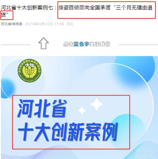河北省消費(fèi)者權(quán)益保護(hù)委員會(huì)還在其官方微信公眾號(hào)上,對(duì)康姿百德入選“河北省十大創(chuàng)新案例”進(jìn)行了專(zhuān)題推送,將“三個(gè)月無(wú)理由退貨”作為典范向社會(huì)公開(kāi)推廣。(原文鏈接請(qǐng)點(diǎn)擊:河北省十大創(chuàng)新案例七:康姿百德面向全國(guó)承諾“三個(gè)月無(wú)理由退貨”)