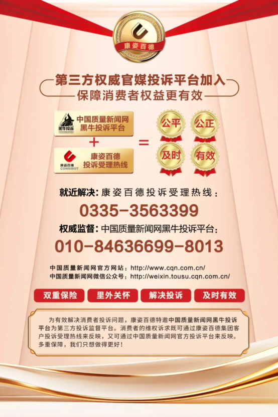 為了進(jìn)一步提升專(zhuān)賣(mài)店的服務(wù)水平,更好地保護(hù)消費(fèi)者的合法權(quán)益,康姿百德開(kāi)通企業(yè)投訴受理熱線,加入了中國(guó)消費(fèi)者協(xié)會(huì)“智慧315”消費(fèi)維權(quán)投訴平臺(tái),還特邀“中國(guó)質(zhì)量新聞網(wǎng)黑牛投訴平臺(tái)”作為第三方投訴監(jiān)督平臺(tái)。并且,統(tǒng)一制作監(jiān)督舉報(bào)公示牌張貼在全國(guó)所有門(mén)店,主動(dòng)接受消費(fèi)者的監(jiān)督。多重途徑保障消費(fèi)者的合法權(quán)益,真正做到投訴有渠道,事事有回音,件件有著落,讓廣大消費(fèi)者購(gòu)買(mǎi)無(wú)憂。