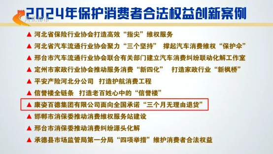 2025年3月15日,康姿百德集團(tuán)有限公司面向全國承諾“三個月無理由退貨”成功入選河北省消保委評選的“2024年保護(hù)消費(fèi)者合法權(quán)益創(chuàng)新案例”,并被河北省消保委作為典范,向全社會推廣。