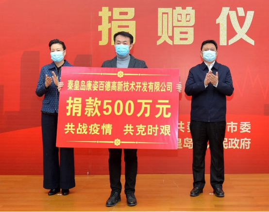 2020年2月1日,康姿百德集團(tuán)參加由秦皇島市市委、市政府舉行的“同舟共濟(jì)共克時(shí)艱堅(jiān)決打贏疫情防控阻擊戰(zhàn)”捐贈(zèng)儀式,向社會(huì)捐贈(zèng)了500萬元現(xiàn)金和價(jià)值近100萬元的口罩、防護(hù)服等防疫物資。